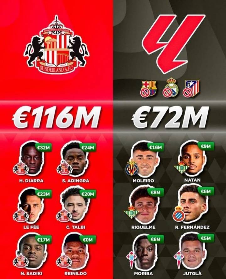 🤯英超升班马桑德兰今夏花1.4亿欧,超西甲除皇萨竞外17队之和